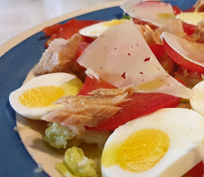 ...Pero ayer la ''tunee''... cambie la lechuga por cogollos picaditos... me pase en echar ajo prensado (con medio es suficiente)... la patata cocida la sustituí por queso semicurado potente en sabor... para el huevo duro empleé los ''huevos belgas'' que guardaba en la nevera (conservados en vinagre hace más de un mes)... y solo respeté a los tomates de estas tierras (con auténtico sabor a tomate de verdad)... y el bonito del norte (imprescindible para poderla llamar periñaca)...