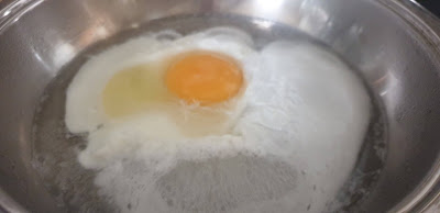 ...Me entretuve en ''freír en agua'' unos huevos... y en cocer media docena de langostinos... para dar otro toque al plato... y hacerlo más completo...